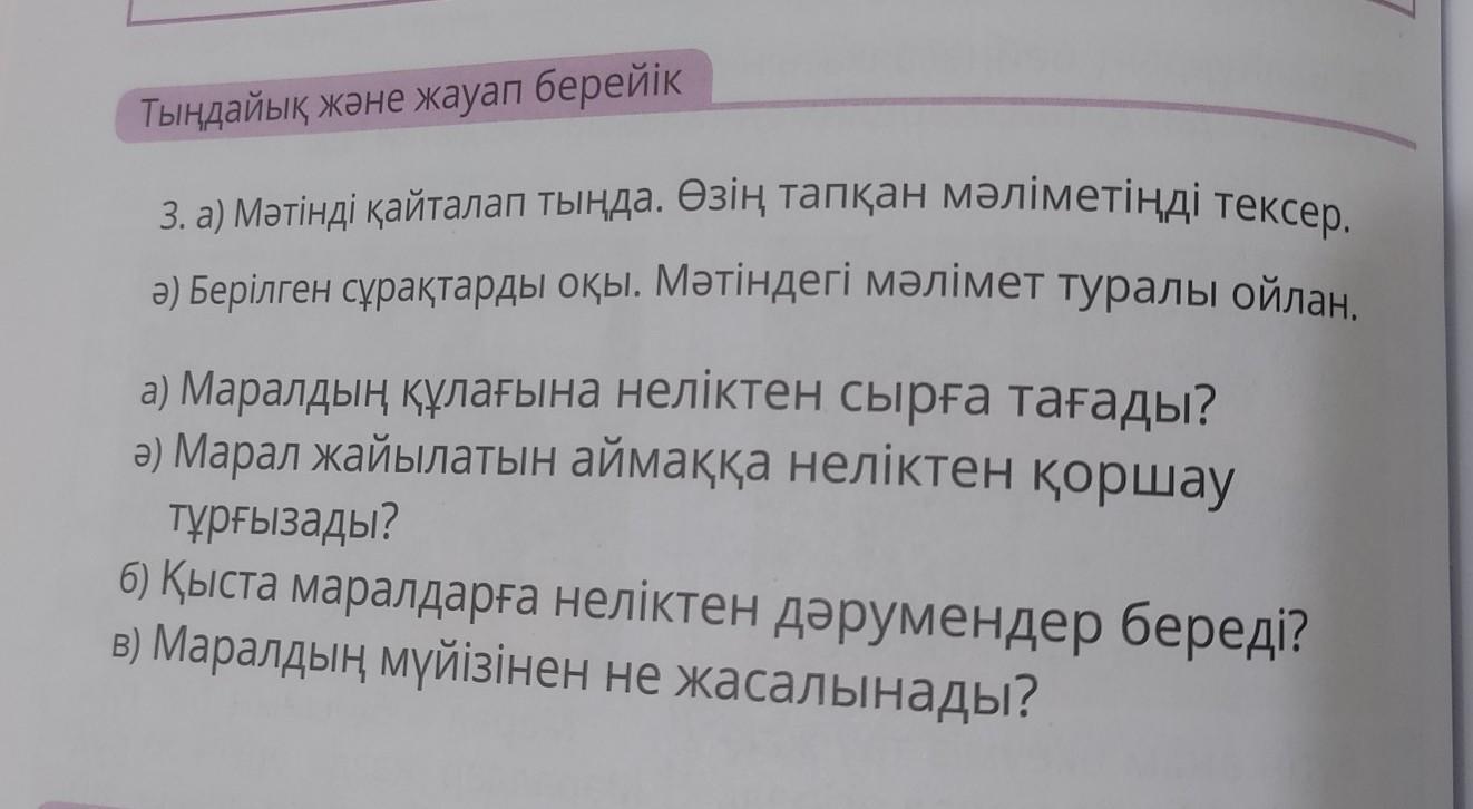 Тыңдайық және жауап берейік 3. а) Мәтінді қайталап тыңда. Өзің тапқан мәліметіңді тексер. ә) Берілген сұрақтарды оқы. Мәтіндегі мәлімет туралы ойлан. а) Маралдың құлағына неліктен сырға тағады? ә) Марал жайылатын аймаққа неліктен қоршау тұрғызады? 6) Қыста маралдарға неліктен дәрумендер береді? в) Маралдың мүйізінен не жасалынады?