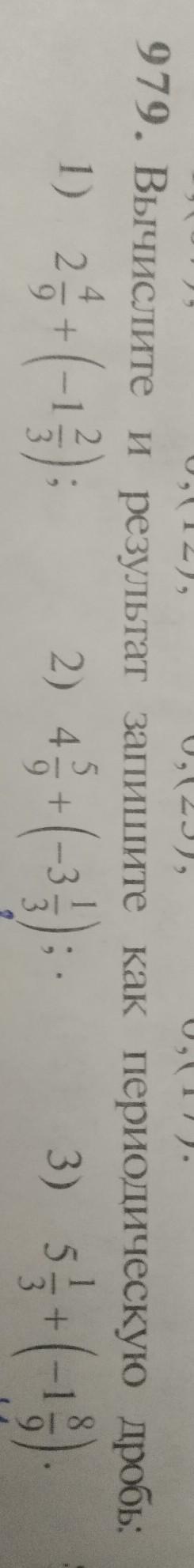 979. Вычислите и результат запишите как периодическую дробь: 1) 25+ (-1) 2) 4 5 + 3) 5(-) помогите пж