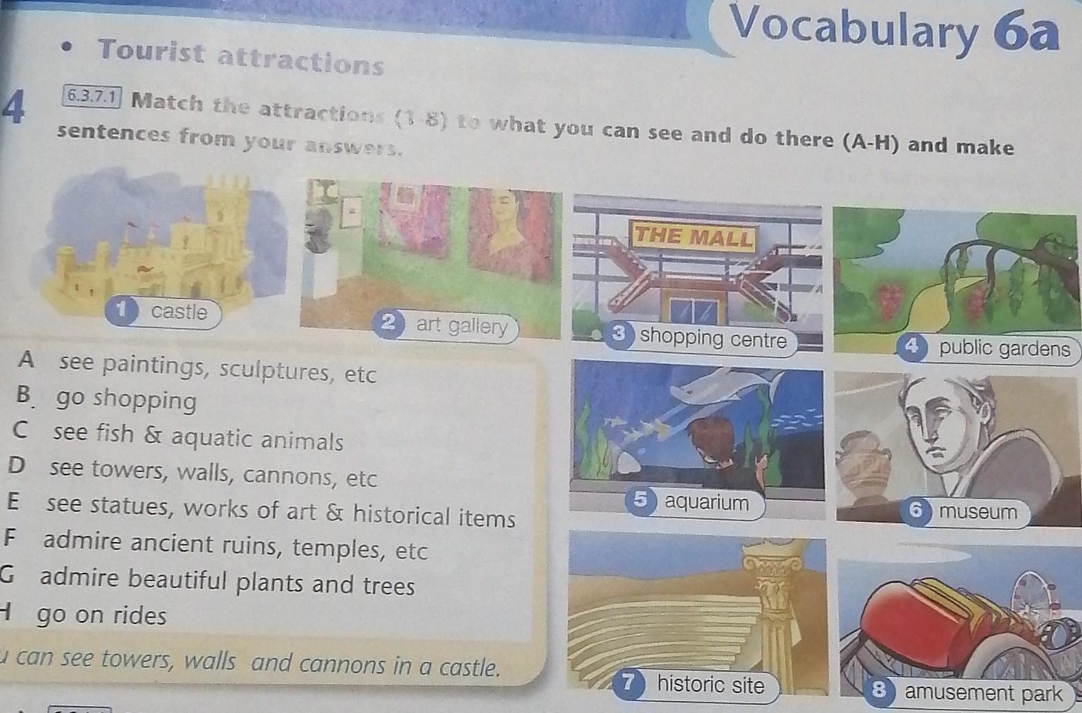 Vocabulary Tourist attractions 63.7.1 Match the attractions (1-8) to what you can see and do there (A-H) and mal sentences from your answers. 4 THE MALL 1) castle 2 art gallery 3 shopping centre pub ndi TO 5 aquarium 6 mu it А see paintings, sculptures, etc B. go shopping C see fish & aquatic animals see towers, walls, cannons, etc E see statues, works of art & historical items F admire ancient ruins, temples, etc G admire beautiful plants and trees H go on rides You can see towers, walls and cannons in a castle. a 7 historic site 8 amus