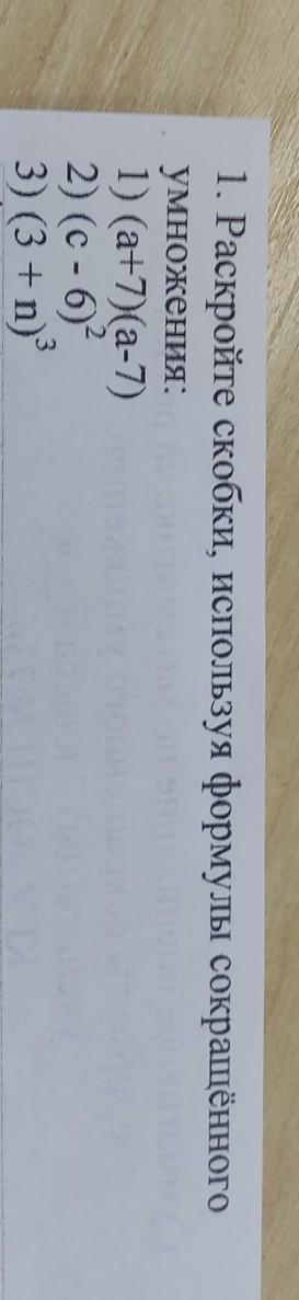 1. Раскройте скобки, используя формулы сокращённого умножения: 1) (a+7)(a-7) 2) (с - 6)? 3) (3 +n) 3) 3 + 2 3