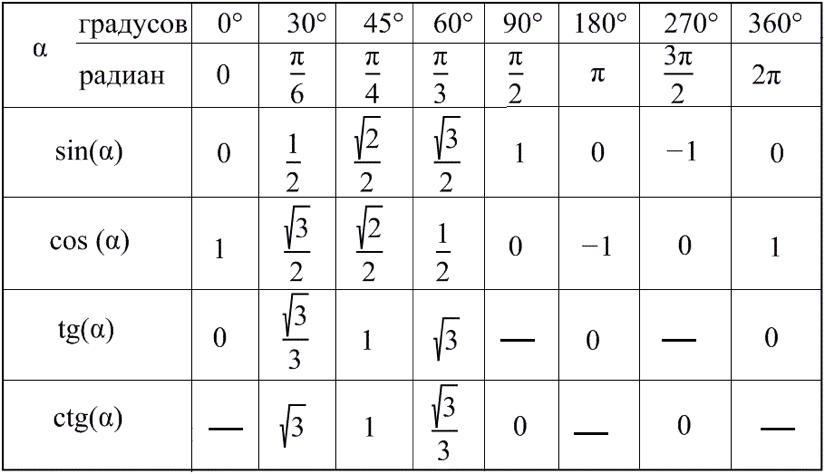 Углы 0°,30°,45°,60°,90°,180°,270°,360°,(π/6,π/4,π/3,π/2,π,3π/2,2π). Таблица синусов, косинусов, тангенсов и котангенсов 30°,45°,60°,90°,180°,270°,360. Значения синусов и косинусов
