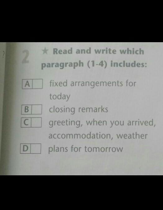 2. * Read and write which paragraph (1-4) includes: A B fixed arrangements for today closing remarks greeting, when you arrived, accommodation, weather plans for tomorrow C D