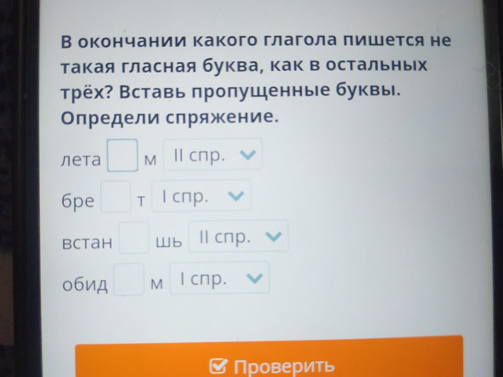 В окончании какого глагола пишется не такая гласная буква, как в остальных трёх? Вставь пропущенные буквы. Определи спряжение. лета M M бре T > Встан ШЬ > обид м M < не обращайте внимание на сприжение