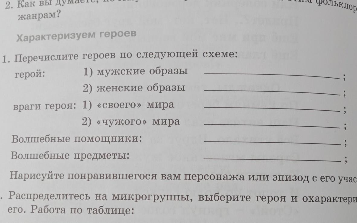 Перечислите героев по следующей схеме: герой: 1) мужские образы 2) женские образы враги героя: 1) «своего» мира 2) «чужого» мира Волшебные помощники: Волшебные предметы: 3 Нарисуйте понравившегося вам персонажа или эпизод с его участием.