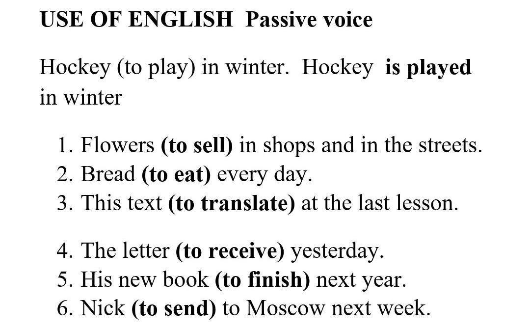 USE OF ENGLISH Passive voice Нockey (to play) in winter. Hockey is played in winter 1. Flowers (to sell) in shops and in the streets. 2. Bread (to eat) every day. 3. This text (to translate) at the last lesson. 4. The letter (to receive) yesterday. 5. His new book (to finish) next year. 6. Nick (to send) to Moscow next week.