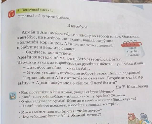 2. Мне кажется у Аяна было хорошее настроение , потому что он вежливо разговаривал с бабушкой. У Армана было плохое настроение, потому что он при виде бабушки отвернулся к окну.