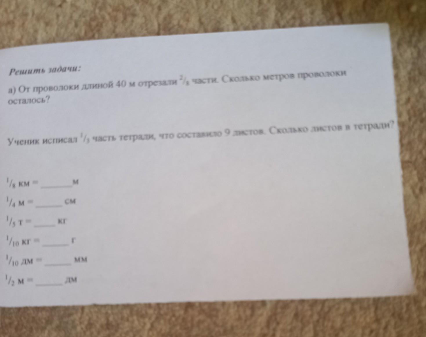 Редаать задачи: а) От проволоки длиной 40 м отрезали 2/8 части. Сколько метров проволоки осталось? Б) Ученик исписал 5 часть тетради, что составило 9 листов. Сколько листов в тетради?