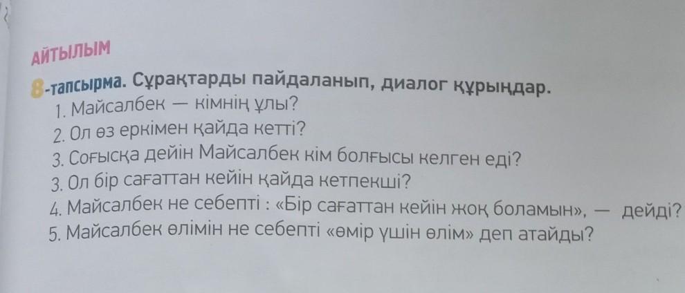 1. Майсалбек 3-тапсырма. Сұрақтарды пайдаланып, диалог құрыңдар. кімнің ұлы? 2. Ол өз еркімен қайда кетті? 3. Соғысқа дейін Майсалбек кім болғысы келген еді? 3. Ол бір сағаттан кейін қайда кетпекші? Майсалбек не себепті : «Бір сағаттан кейін жоң боламын», – дейді? 5. Майсалбек өлімін не себепті «өмір үшін өлім» деп атайды?