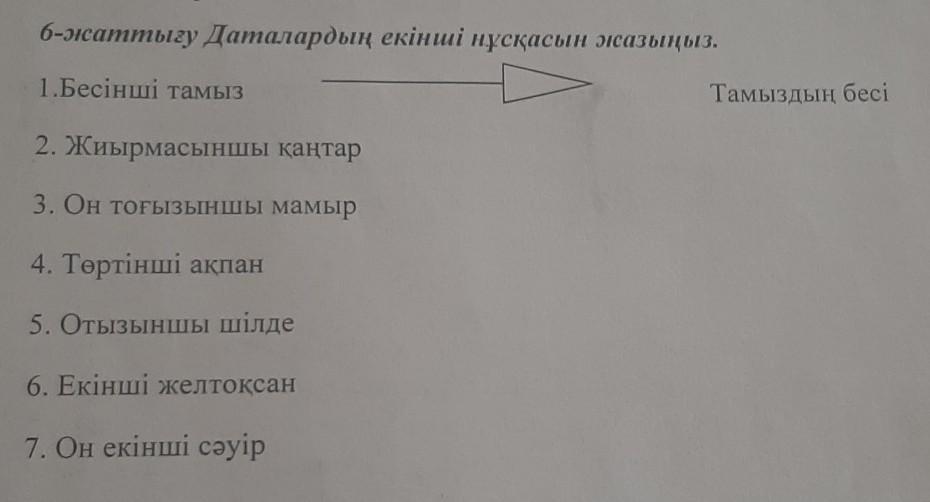 6-жаттыгу Даталардың екінші нұсқасын жазыныз. 1.Бесiншi тамыз Тамыздын бесі 2. Жиырмасыншы кантар 3. Он тогызыншы мамыр 4. Тертiншi акпан 5. Отызыншы шiлде 6. Екiншi желтоксан 7. Он екiншi сәуір