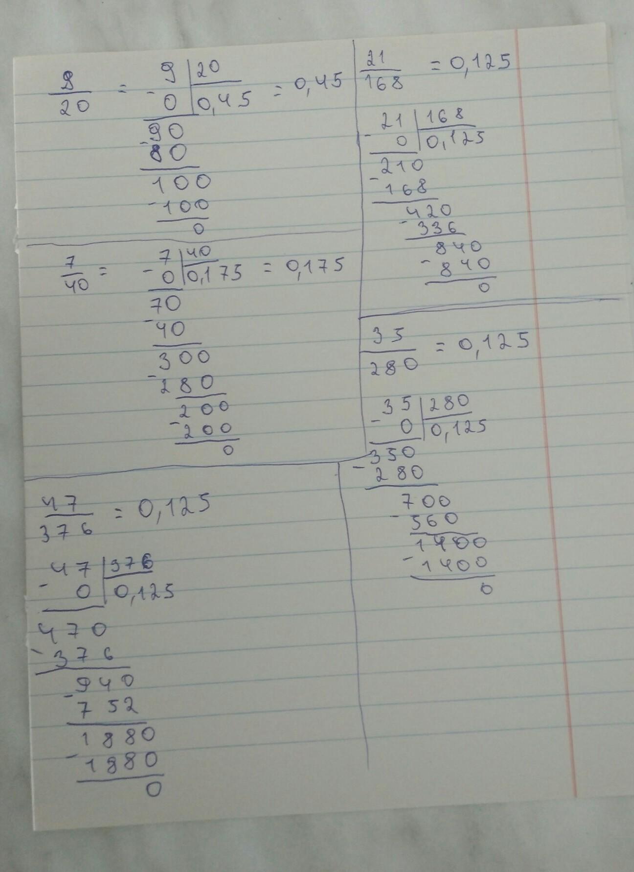 Обратите в десятичные дроби с помощью столбика: 9/20; 7/40; 11/400; 21/168; 35/280; 47/376.