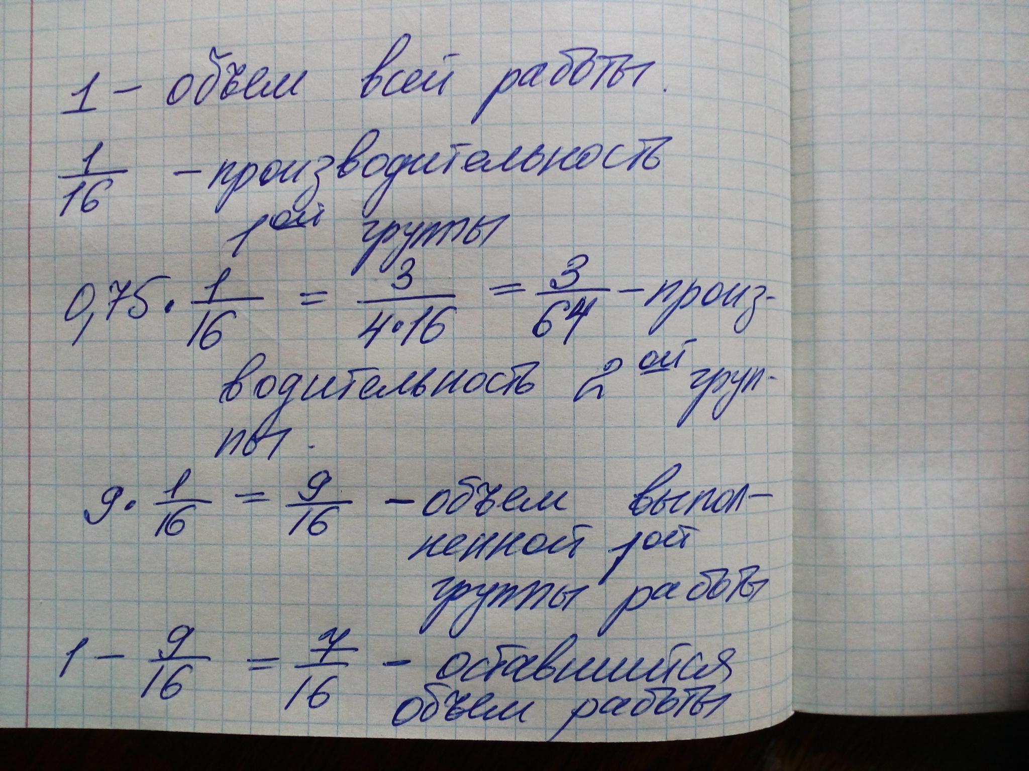 Одна группа рабочих выполняет работу за 16 дней, а другая – за 0,75 времени, которое тратит первая группа на выполнение работы. После того как первая группа рабочих работала 9 дней, к ней на помощь пришла вторая группа рабочих, и они вместе выполнили всю работу. Определите, сколько дней обе группы рабочих работали вместе.