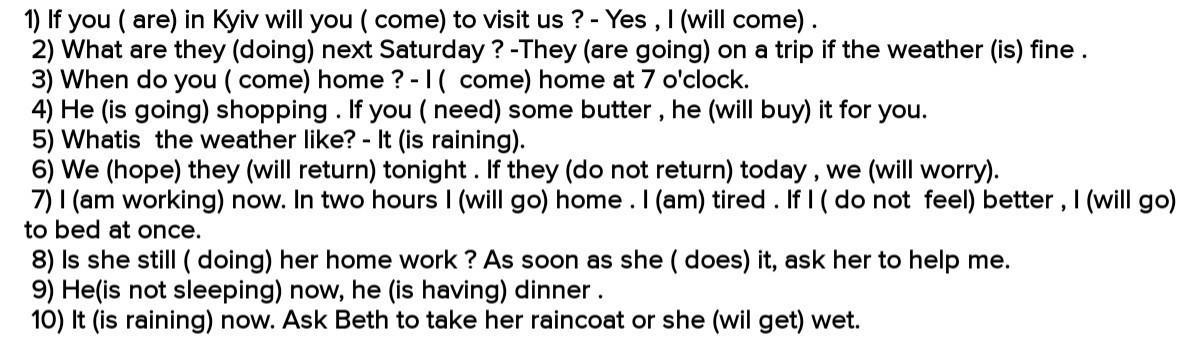 СРОЧНО!!! Даю 50 балов Present Simple or Future Simple 1. .... you (to know) what you want to do after you (to finish) school? 2. Ann ( not to come) in time because she (to have) to finish a report. 3. ... they (to join) out team if the trainer (to ask)? 4. As soon as he (to arrive) to Rome, I (to call) you. 5. If he (not to buy) a map, we (to get) lost. 6. What we (to do) tonight if it (rain)? 7. If it (to rain) this weekend, we (to train) in the gym. 8. Mr. Brown (not to meet) us at the airport if his son (not to remember) him. 9. After he (to find) out the truth, he (not to go) to the party. 10. How we (to get) there if he (not to send) us money? 11. Where she (to stay) for two or three days untill she (to buy) a new flat? 12. You (not to fail) this test if you (to be) attentive.