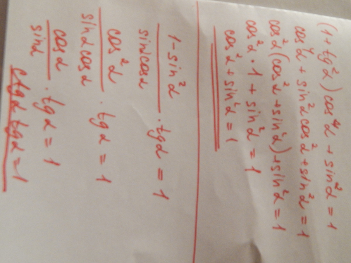 Помогите решить!1)докажите тождества:а) (1+tg^2a)cos^4a+sin^2a=1 б) 1-sin^2a (- в числителе) sina×cosa (-в знаменателе) и всё это умноженное на tga=1