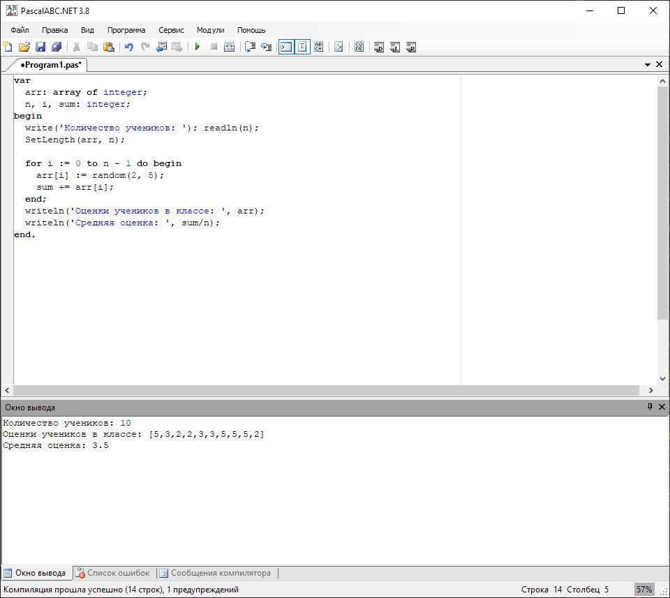 Для начала выделяем память массиву целых чисел, после - регистрируем переменные, которые будем использовать далее. Запрашиваем кол-во учеников (это и будет размерностью массива), устанавливаем длину массива - введённое число n. Циклом проходима по элементам массива, устанавливаем рандомное значение от 2 до 5 и суммируем элементы. В конце выводим сам массив и высчитываем среднюю оценку как среднее арифметическое чисел.