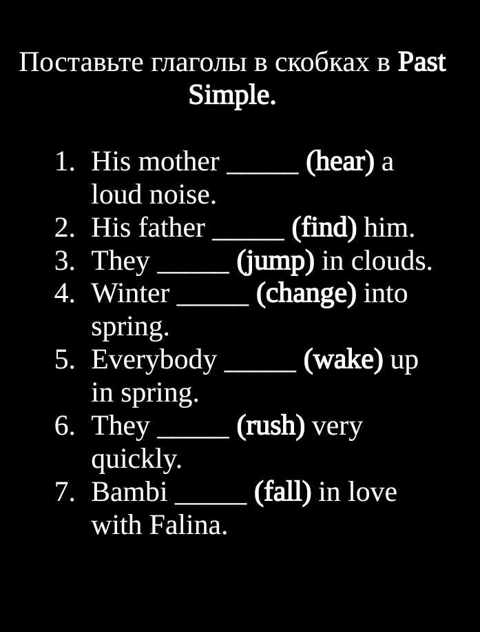 Find - found, jump- jumped change- changed, wake- woke, rush- rushed, fall- fell