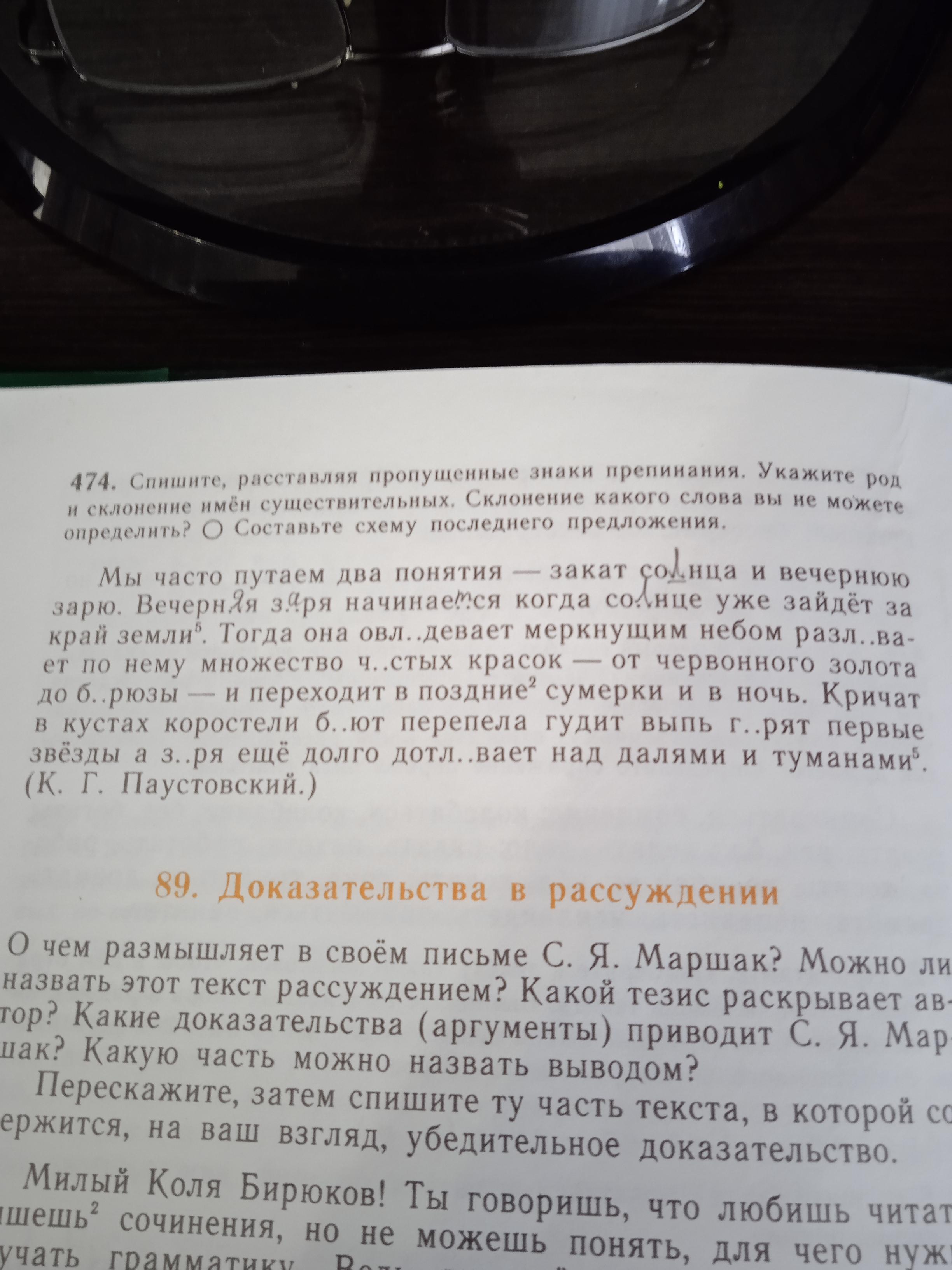Мы часто путаем два понятия(2 скл.,ср.р.) - закат(2 скл., м.р.) солнца(2 скл., ср.р.) и вечернюю зарю(1 скл.,ж.р.) . Вечерняя заря(1 скл.,ж.р.) начинается, когда солнце(2 скл.,ср.р.) уже зайдёт за край(2 скл.,м.р.) земли(1 скл.,ж.р.) . Тогда она овладевает меркнующим небом(2 скл.,ср.р.), разливает по нему множество(2 скл.,ср.р.) чистых красок(1 скл.,ж.р.) - от червонного золота(2 скл.,ср.р.) до бирюзы(1 скл.,ж.р.) - и переходит в поздние сумерки( мн.ч.) и в ночь(3 скл.,ж.р.) Кричат в кустах(2 скл., м.р.) коростели(2 скл.,м.р.), бьют перепела(2 скл.,м.р.) , гудит выпь(3 скл.,м.р.) , горят первые звёзды(1 скл.,ж.р.) , а заря(1 скл.,ж.р.) ещё долго дотлевает над далями(3 скл.,ж.р.) и туманами(3 скл.,м.р.).