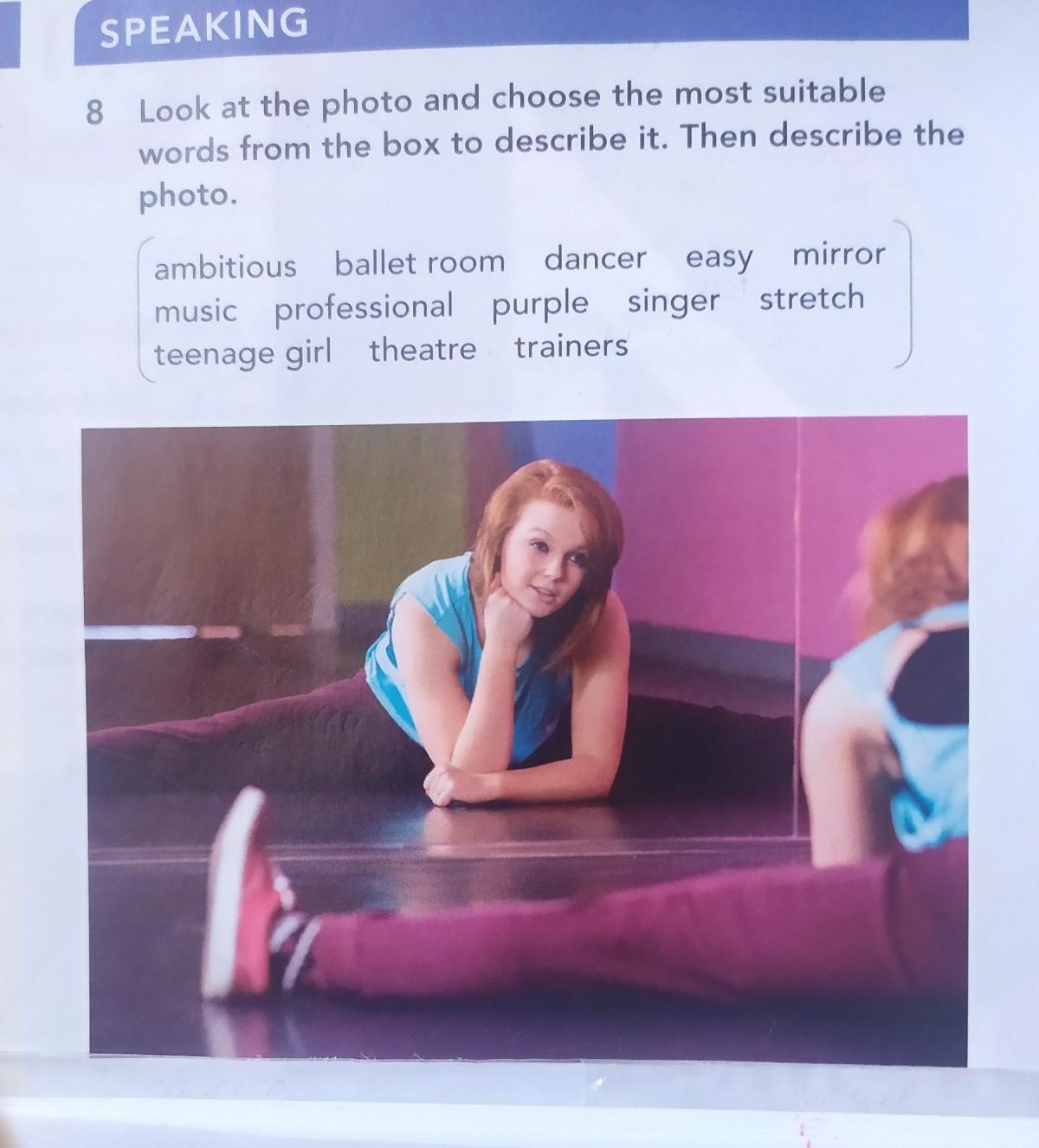 stretch, teenage girl, dancer, mirror, purple, trainers.