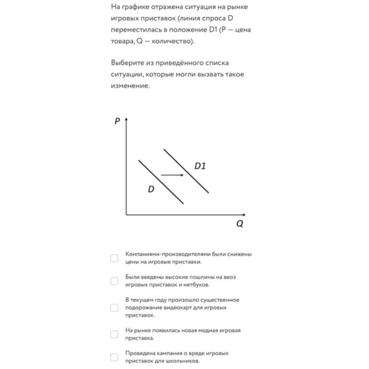 На графике отражена ситуация на рынке игровых приставок (линия спроса D переместилась в положение D1 (P - цена товара, Q - количество).