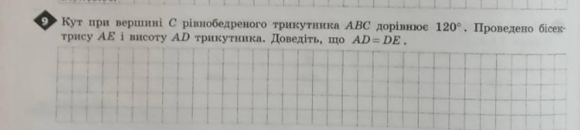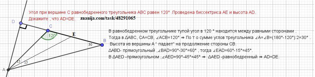 Угол при вершине С равнобедренного треугольника АВС равен 120° .Проведена биссектриса АЕ и высота АD. Докажите , что AD=DE.