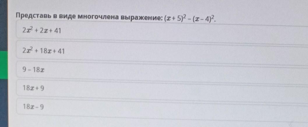 Представь в виде многочлена выражение: (x+5)? - (1-4). 222 +23+ 41 212 + 181+ 41 9-182 182+ 9 18х - 9