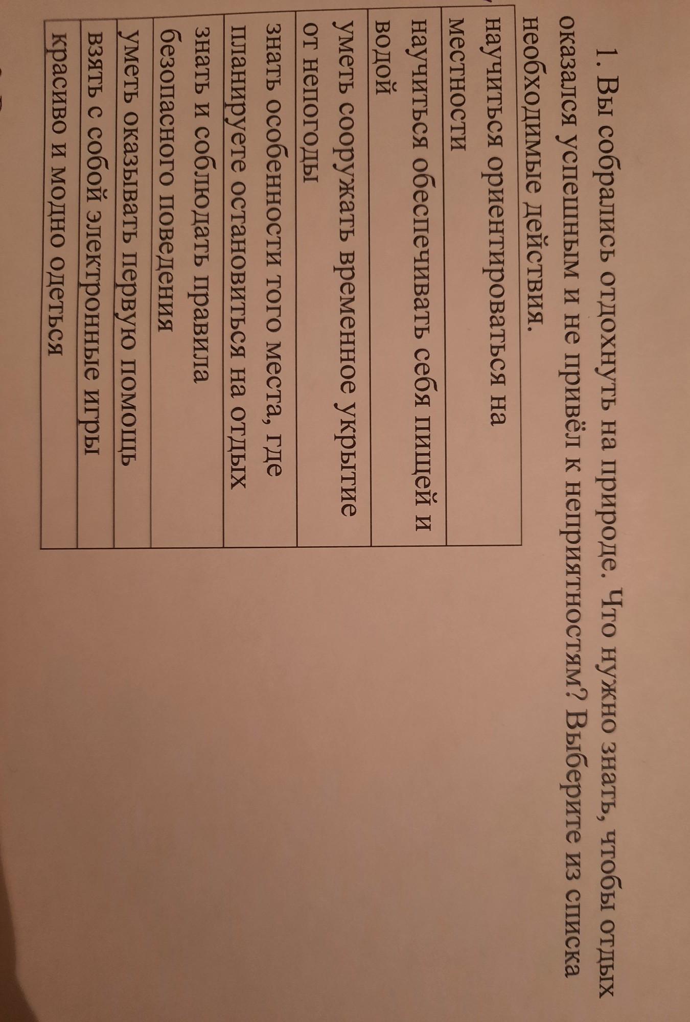 1. Вы собрались отдохнуть на природе. Что нужно знать, чтобы отдых оказался успешным и не привёл к неприятностям? Выберите из списка необходимые действия.