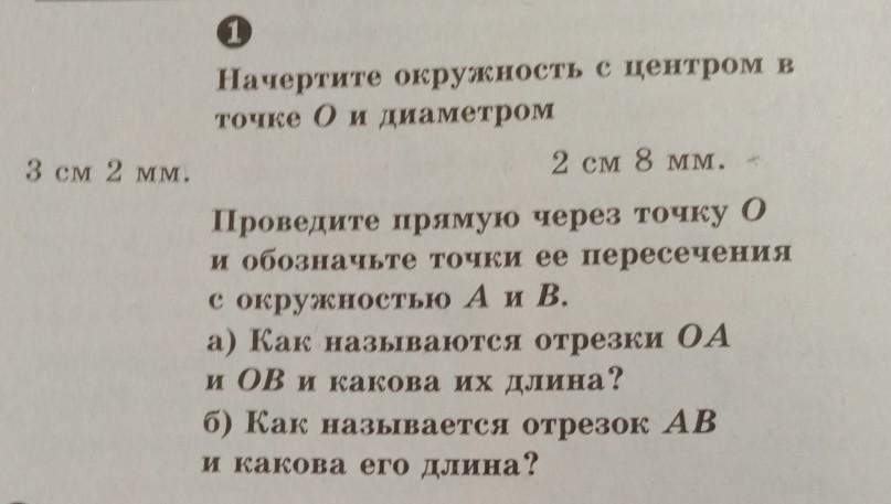 Начертите окружность с центром в точке O и диаметром 3 см 2 мм. Проведите прямую через точку O и обозначьте точки её пересечения с окружностью A и B.