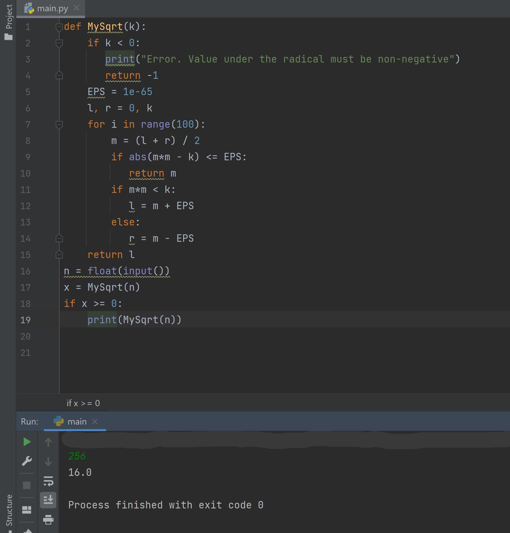 я так понял, что тупо math.sqrt(x) или x**(1/2) прописать нельзя, иначе в чем смысл задачи, да и формулировка "написать функцию" требует кастомную имплементацию. Поэтому так как функция корня непрерывна и монотонна, то воспользуемся идеей простого бинпоиска: (пример работы при n = 256 = 16^2 на фото во вложениях)