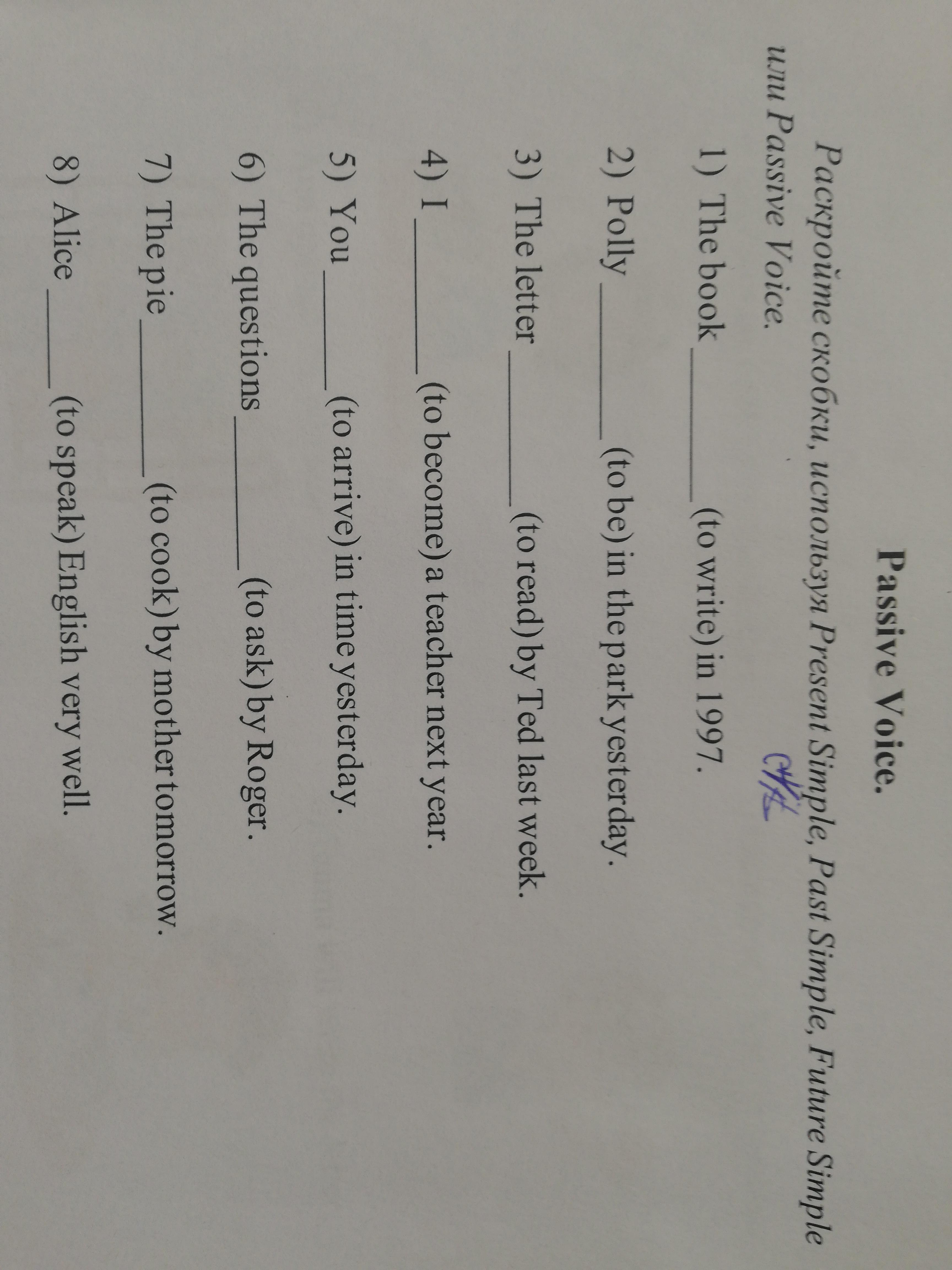 Доброго утра. Раскройте скобки, используя Present Simple, Past Simple, Future Simple или Passive Voice. Вообщем всё на фото. Дам 60 баллов.