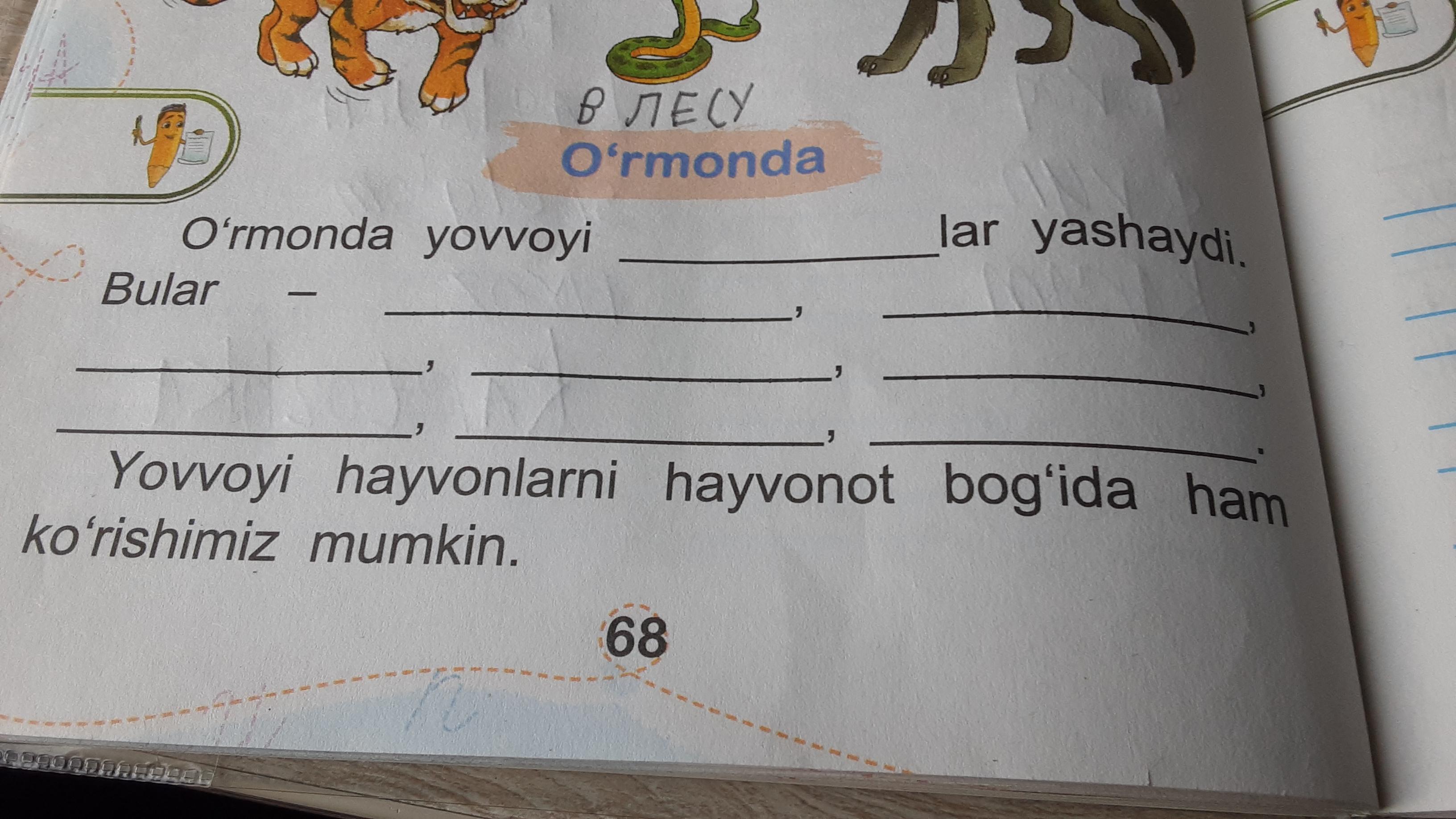 Объяснение: Órmonda yovvoyi hayvonlar yashaydi. Bular yo'lbars,ayiq,kiyik, sher, tulki, yovvoyi quyon. Yovvoyi hayvonlar haven't bog'bog'ida ham ko'ko'rishimiz mumkin.