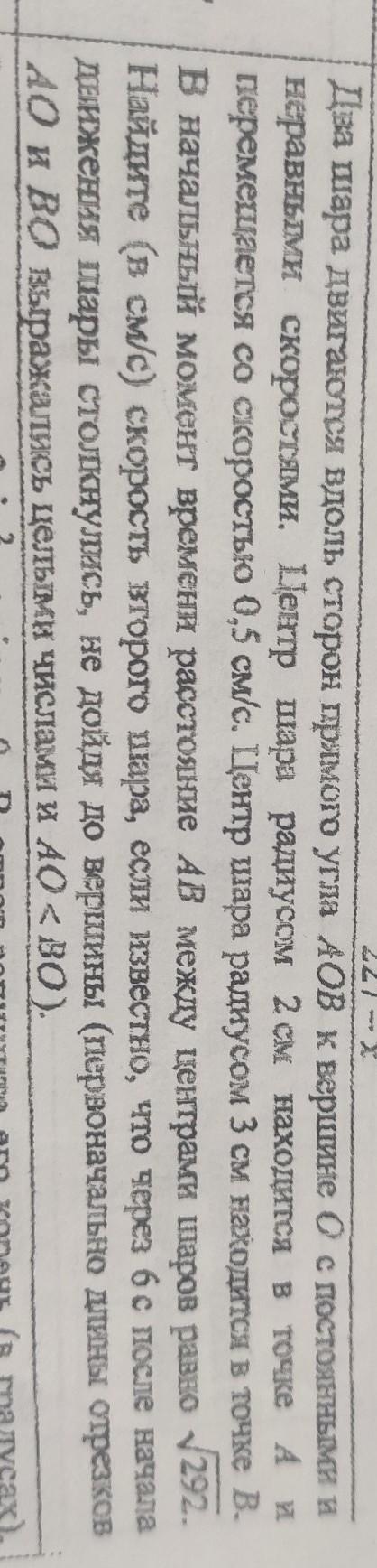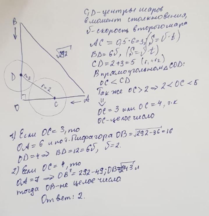 Два шара двигаются вдоль прямого угла АОВ к вершине О с постоянными неравными скоростями. Центр шара радиусом 2см находится а точке А и перемещается со скоростью 0,5м/с. Центр шара радиусом 3см находится в точке В. В начальный момент времени расстояние АВ между центрами шаров равно корень из 292