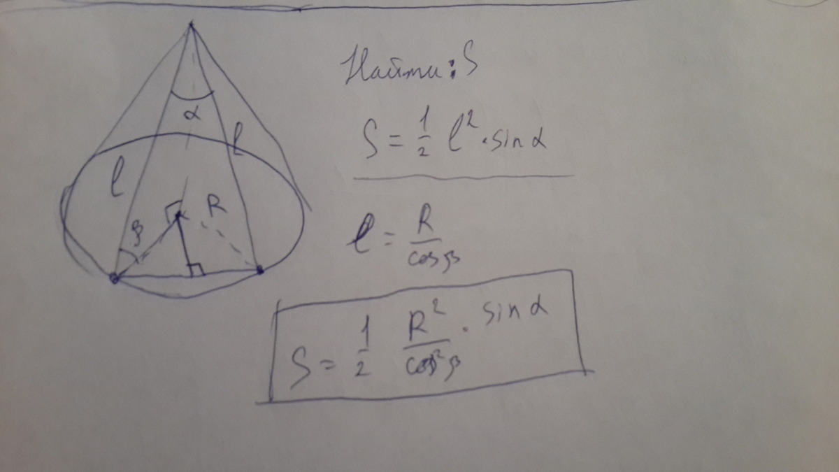 Через две образующие конуса, угол между которыми равен (альфа), проведено сечение. Найдите площадь этого сечения, если радиус основания конуса равен R, а образующая наклонена к плоскости основания под углом (Бетта)