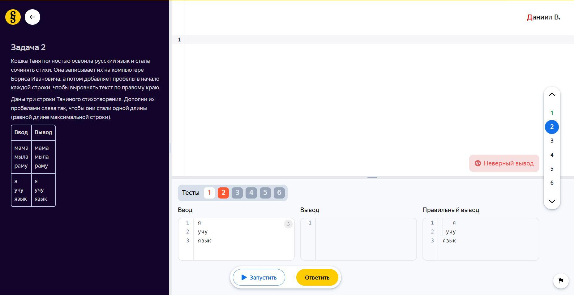 Даны три строки Таниного стихотворения. Дополни их пробелами слева так, чтобы они стали одной длины (равной длине максимальной строки).