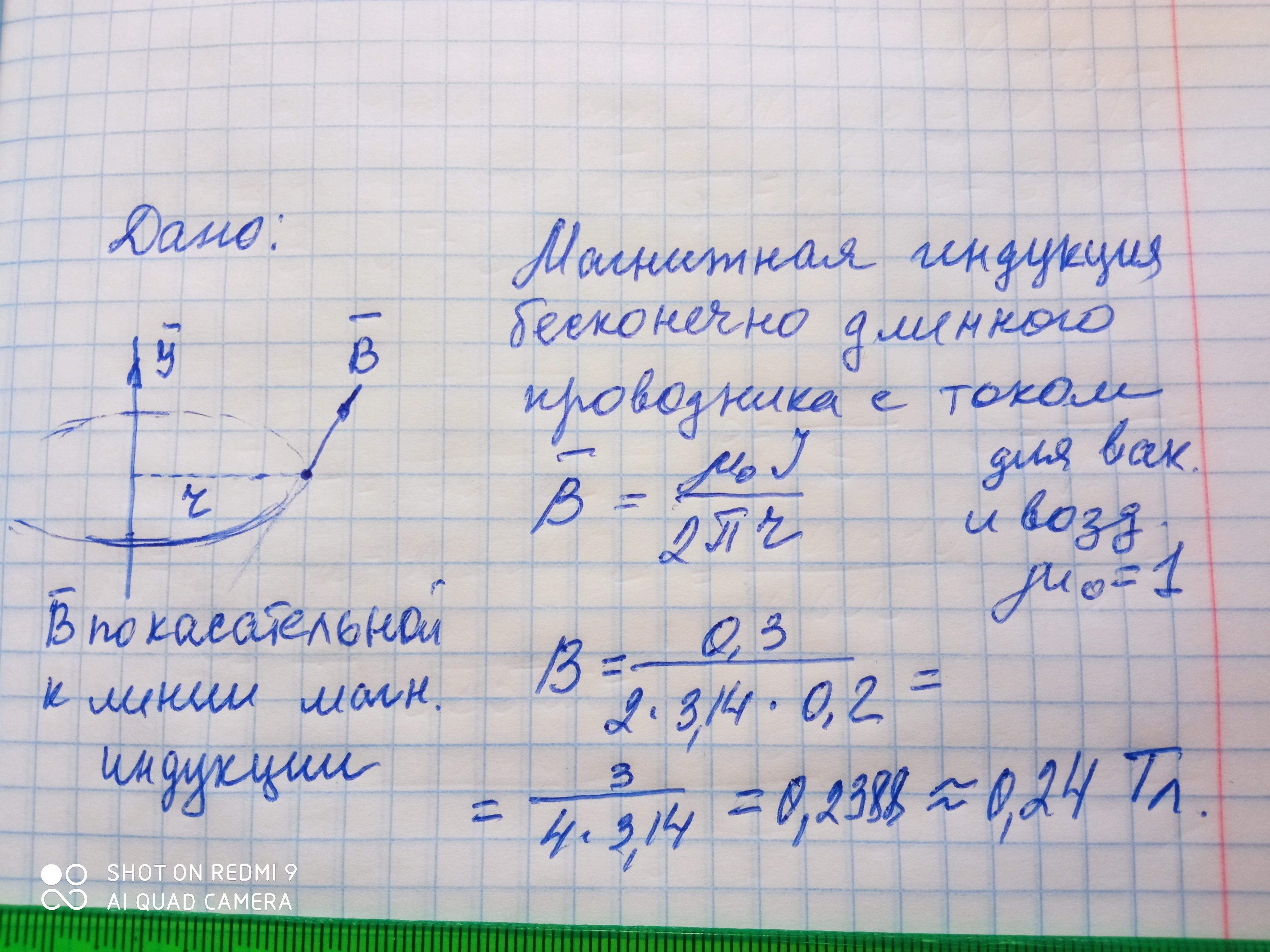 Определить магнитную индукцию в точке, расположенной в воздухе за пределами проводника на расстоянии 20 см от его оси, если ток в проводнике 0,3 А.