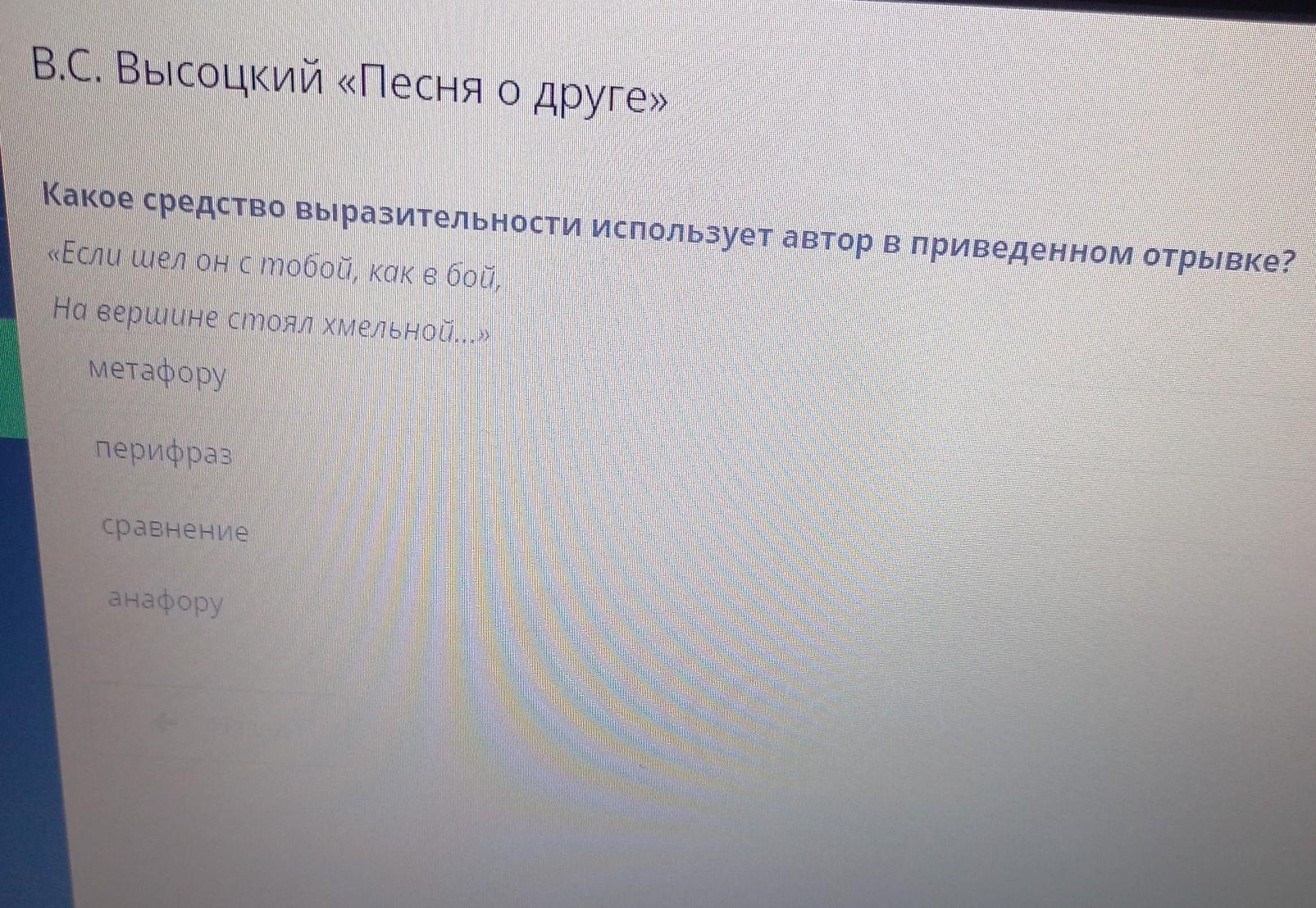 В.С. Высоцкий «Песня о друге» Какое средство выразительности использует автор в приведенном отрывке? «Если шел он с тобой, как в бой, На вершине стоял Хмельной...» метафору перифраз Сравнение анафору