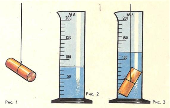 Медное тело (рис. 1) опустили в мензурку с водой (рис. 2) так как показано на (рис. 3)