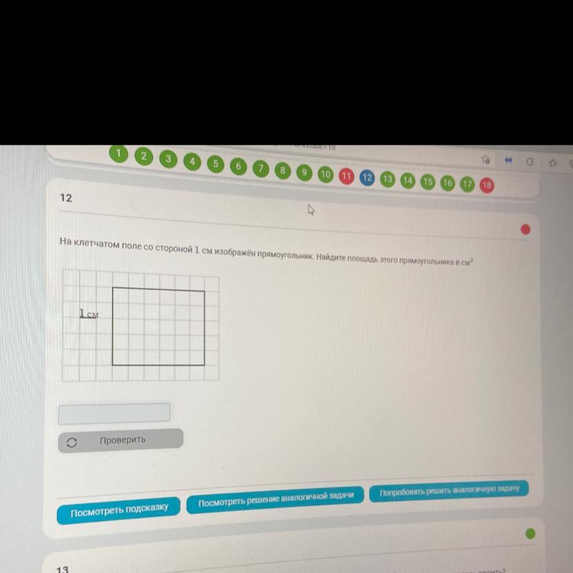 На клетчатом поле со стороной 1 см изображён прямоугольник. Найдите площадь этого прямоугольника в см“.