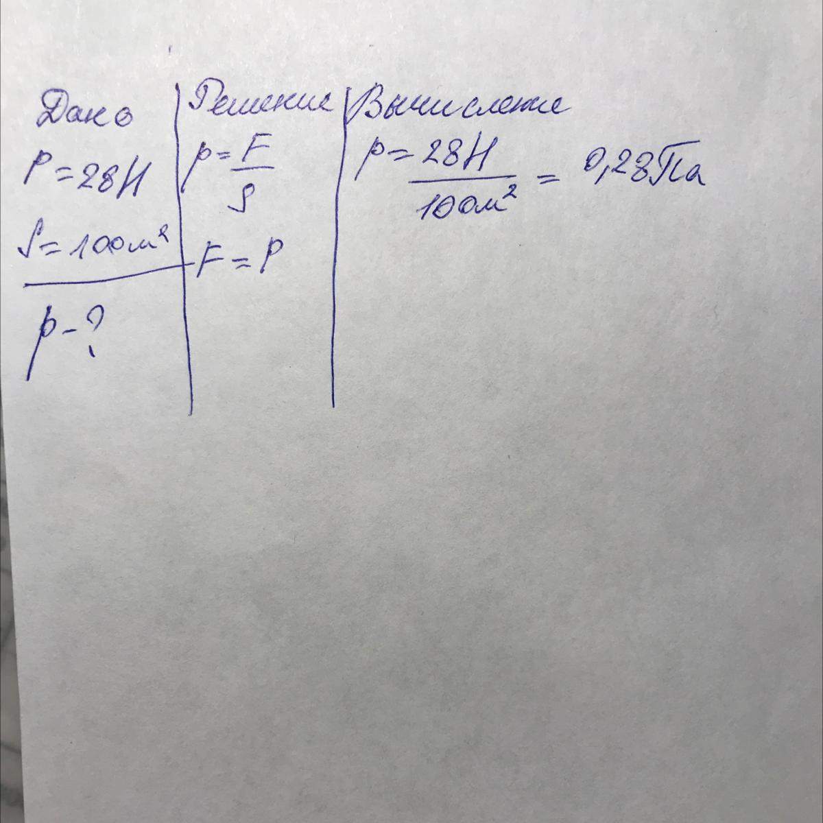 p=F/Sи тогда получается что p=28/100²=7/2500