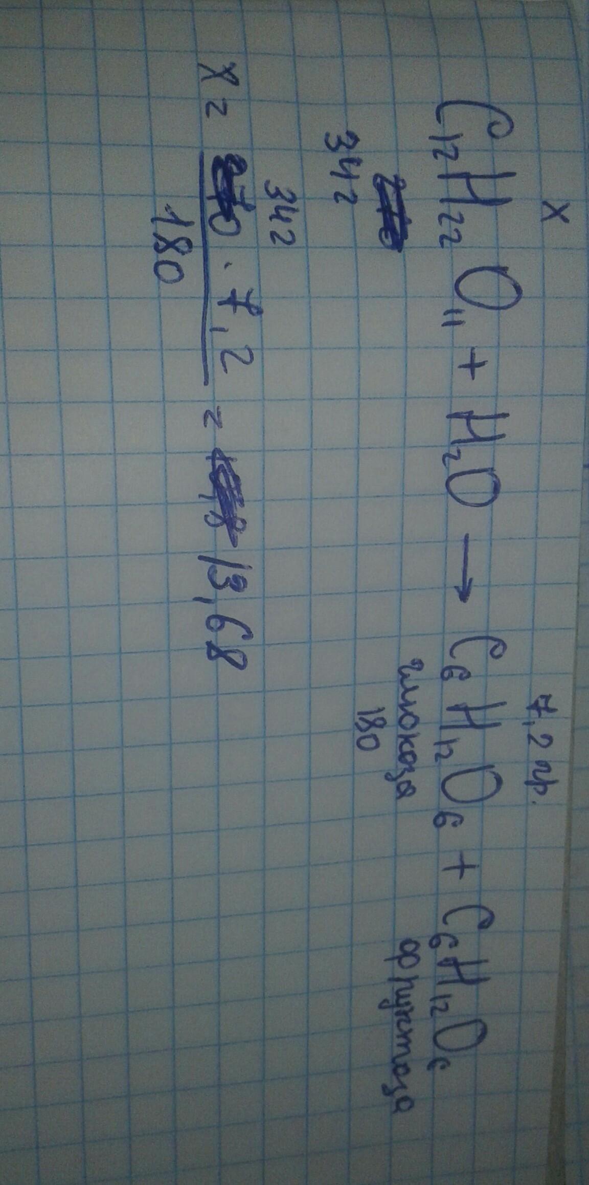 *Определите массу сахарозы, которая вступила в реакцию гидролиза, если было получено 7,2 г глюкозы. (13,68 г)