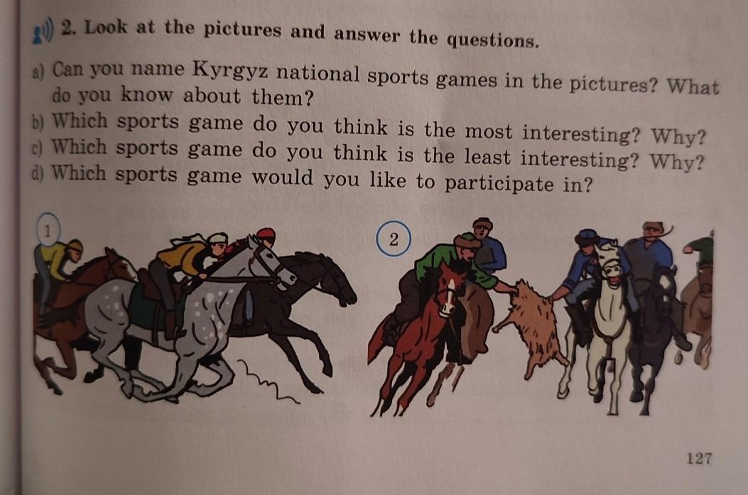 а) Картинка 1. Ат чабыш — скачки на лошадях. Это наиболее популярный среди киргизского населения вид скачек. В этом виде скачек проверялись резвость лошади и умение всадника управлять ею. В качестве всадников обычно выступали дети. Дистанции пробега устанавливались от одного условного места (знака) до другого. Победитель скачек награждался подарком.