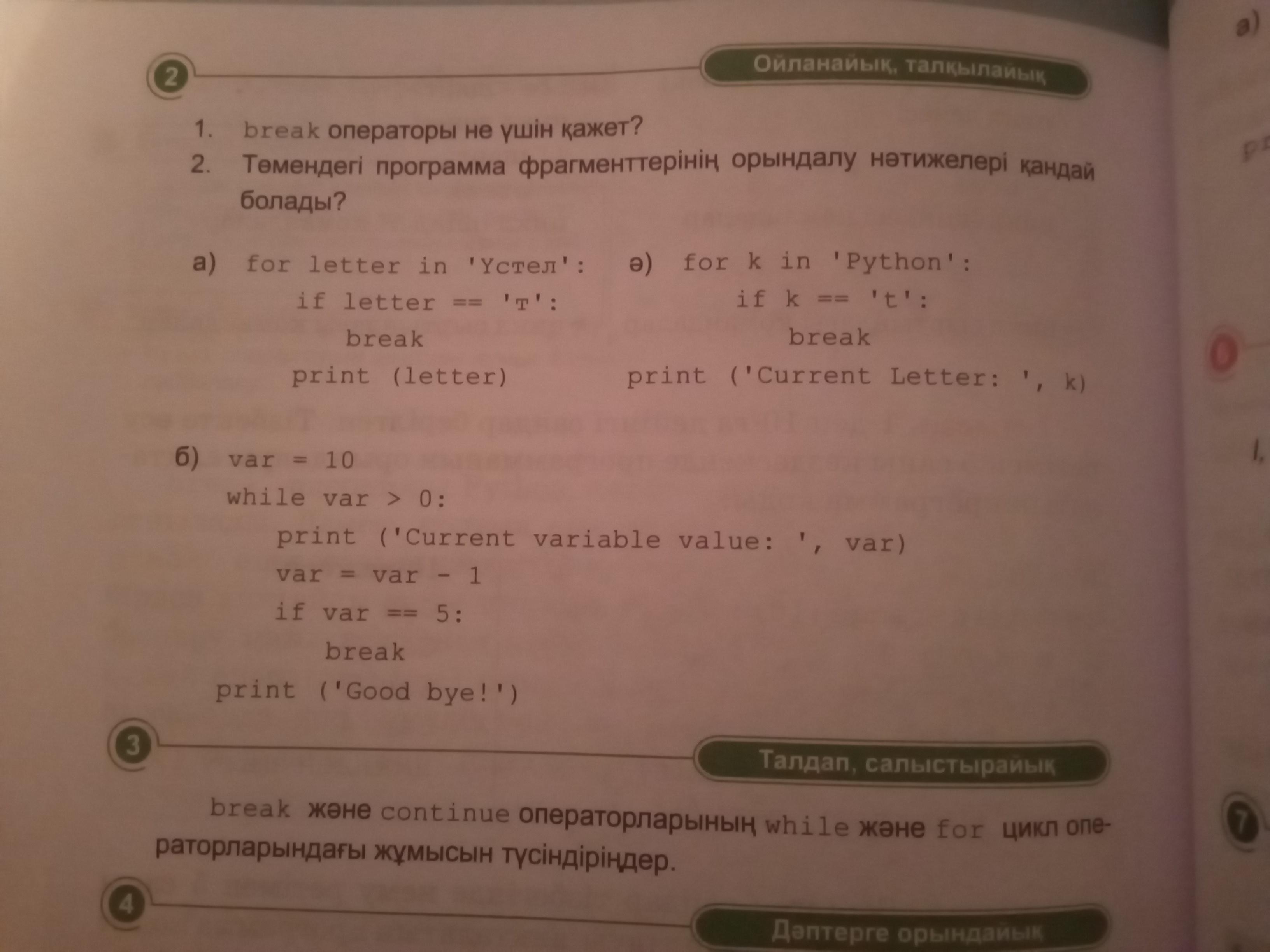 Напишите, результаты после выполнения следующих фрагментов программы?