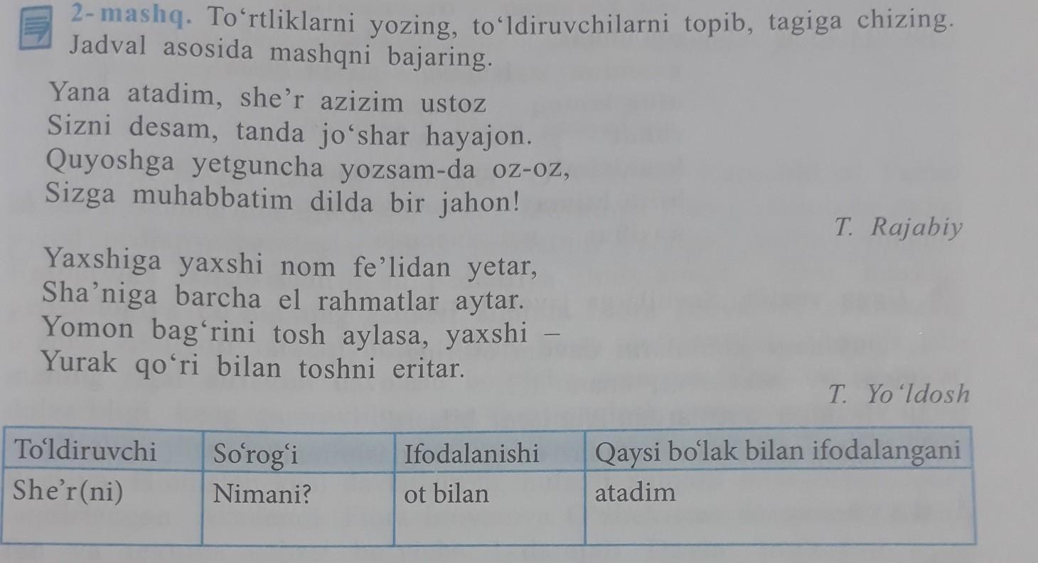 Toʻldiruvchi She'r(ni) Soʻrogʻi Nimani? Ifodalanishi ot bilan Qaysi boʻlak bilan ifodalangani atadim