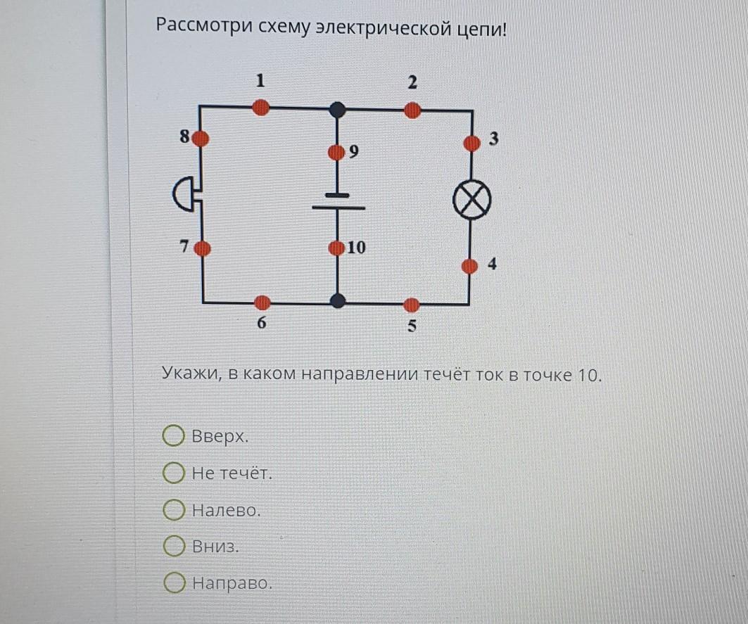 Цепь замкнута. То есть ток по ней течет. Принятое направление движения электрического тока - от плюса к источника к минусу. На схеме плюс источника внизу. Следовательно электрический ток течет по проводнику вниз от плюса.