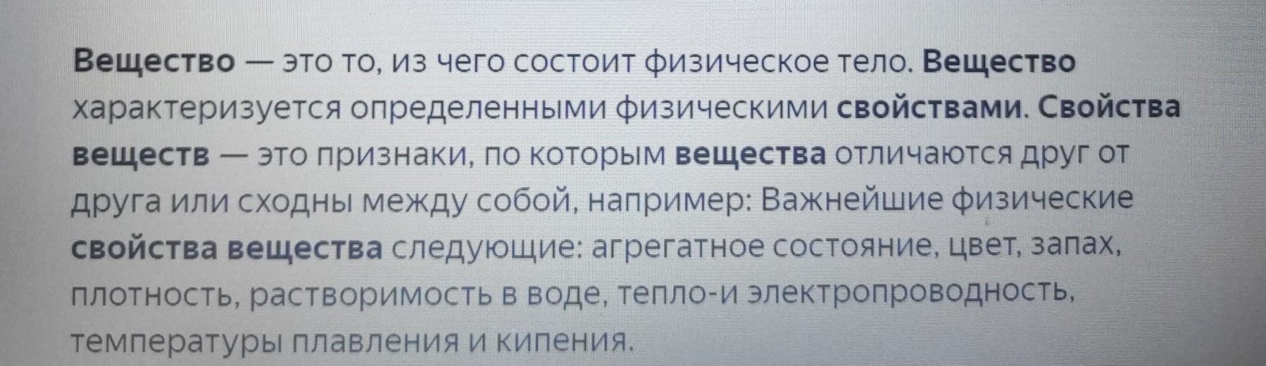 сво́йства вещества — свойства, присущие веществу вне химического взаимодействия: температура плавления, температура кипения, вязкость, плотность, диэлектрическая проницаемость, теплоёмкость, теплопроводность, электропроводность, сорбция, цвет, концентрация, эмиссия, текучесть, твёрдость, пластичность,