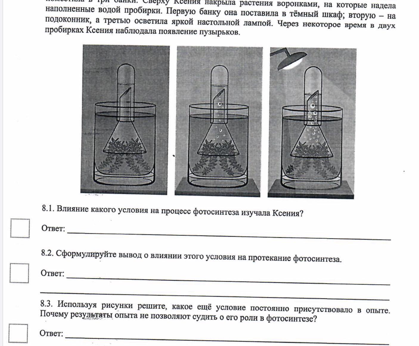 Объяснение:8.1 Ксения изучала влияние света на фотосинтез.