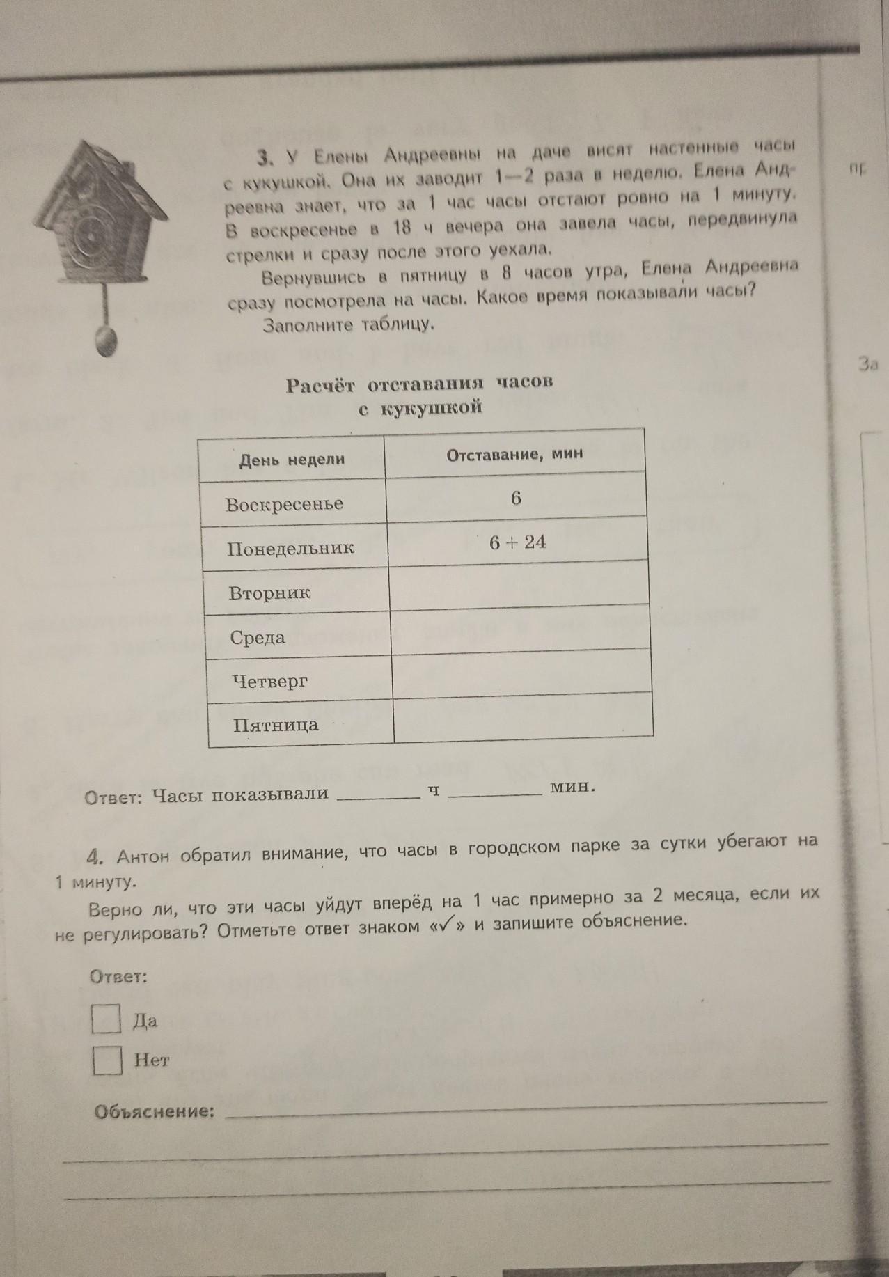 в пятницу Елена Анатольевна вернулась в 8 часов утра, так как прошло только восемь часов, то часы в пятницу отстали только на 8 минут. теперь имеем, за вс, пн, Вт, ср, чт и пт часы отстали на (6+24+24+24+24+8 минут)