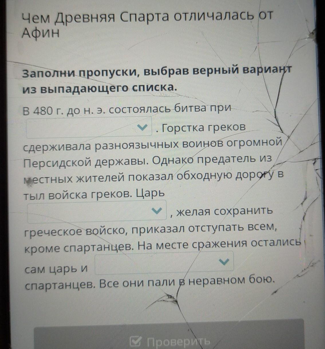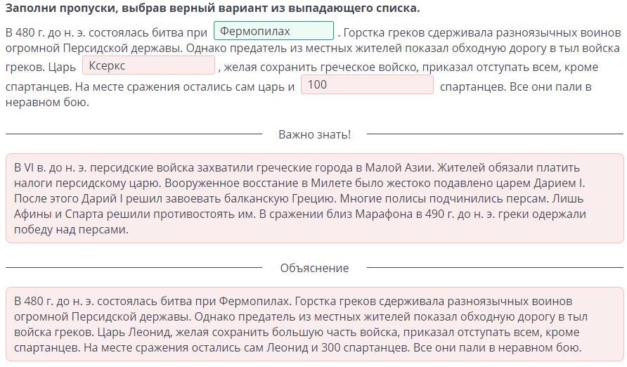 Чем Древняя Спарта отличалась от Афин Заполни пропуски, выбрав верный вариант из выпадающего списка. В 480 г. до н. э. состоялась битва при Горстка греков сдерживала разноязычных воинов огромной Персидской державы. Однако предатель из местных жителей показал обходную дорогу в тыл войска греков. Царь желая сохранить греческое войско, приказал отступать всем, кроме спартанцев. На месте сражения остались І сам царь и спартанцев. Все они пали в неравном бою. можете помочь