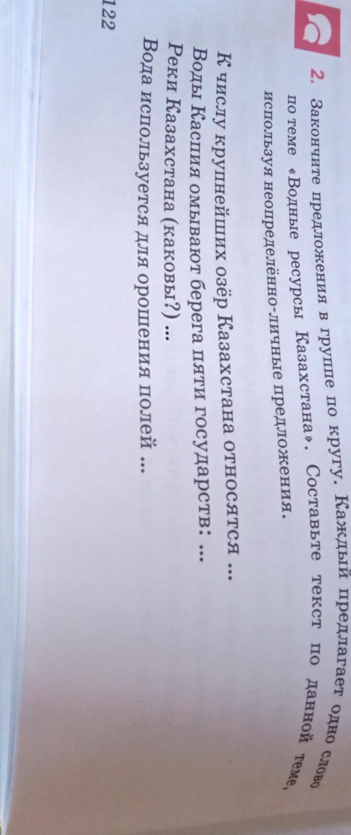 2. Закончите предложения в группе по кругу. Каждый предлагает одно слово по теме «Водные ресурсы Казахстана». Составьте текст по данной теме, используя неопределённо-личные предложения. К числу крупнейших озёр Казахстана относятся ... Воды Каспия омывают берега пяти государств: ... Реки Казахстана (каковы?) ... Вода используется для орошения полей ... 22