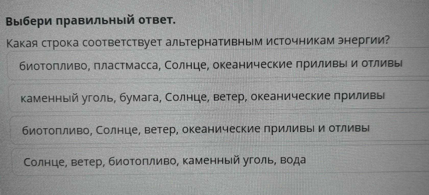 Выбери правильный ответ. Какая строка соответствует альтернативным источникам энергии? биотопливо, пластмасса, Солнце, океанические приливы и отливы каменный уголь, бумага, Солнце, ветер, океанические приливы биотопливо, Солнце, ветер, океанические приливы и отливы Солнце, ветер, биотопливо, каменный уголь, вода