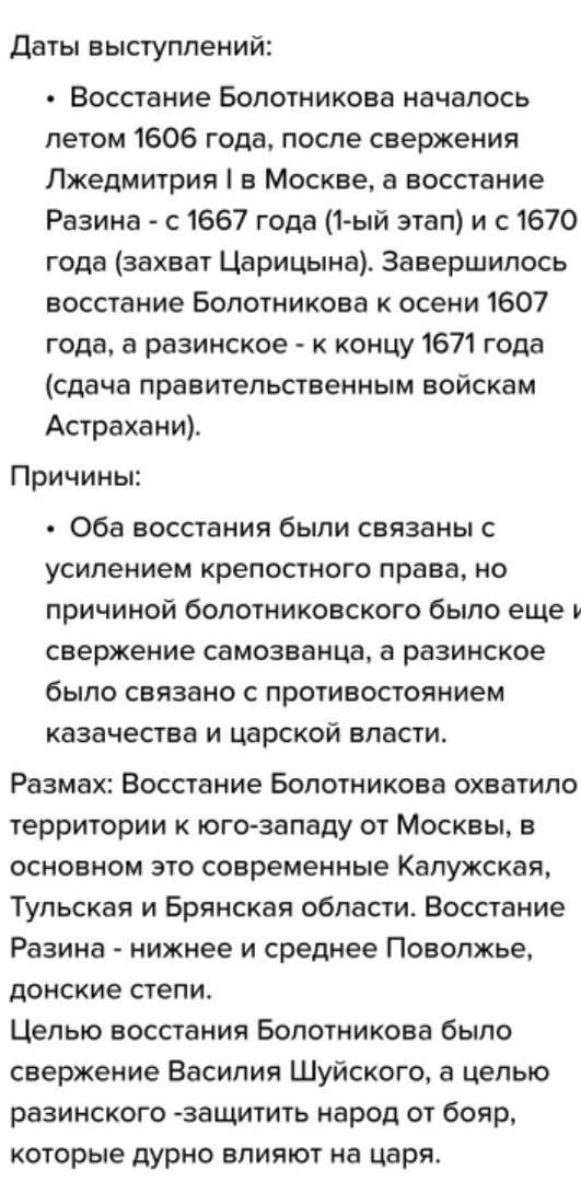 задание 5. Сравните восстание И. Болотникова и походы С. Разина. Напишите в любом виде сходства и различия (даты, природные условия и социальный статус не засчитываются).