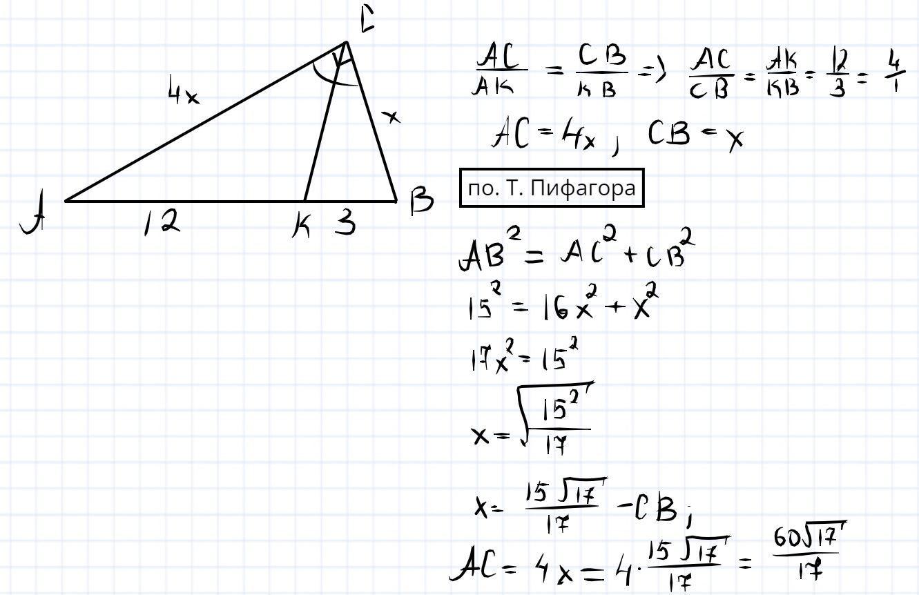 в прямоугольном треугольнике биссектриса прямого угла делит гипотенузу на 12 см и 3 см найдите катеты этого треугольника